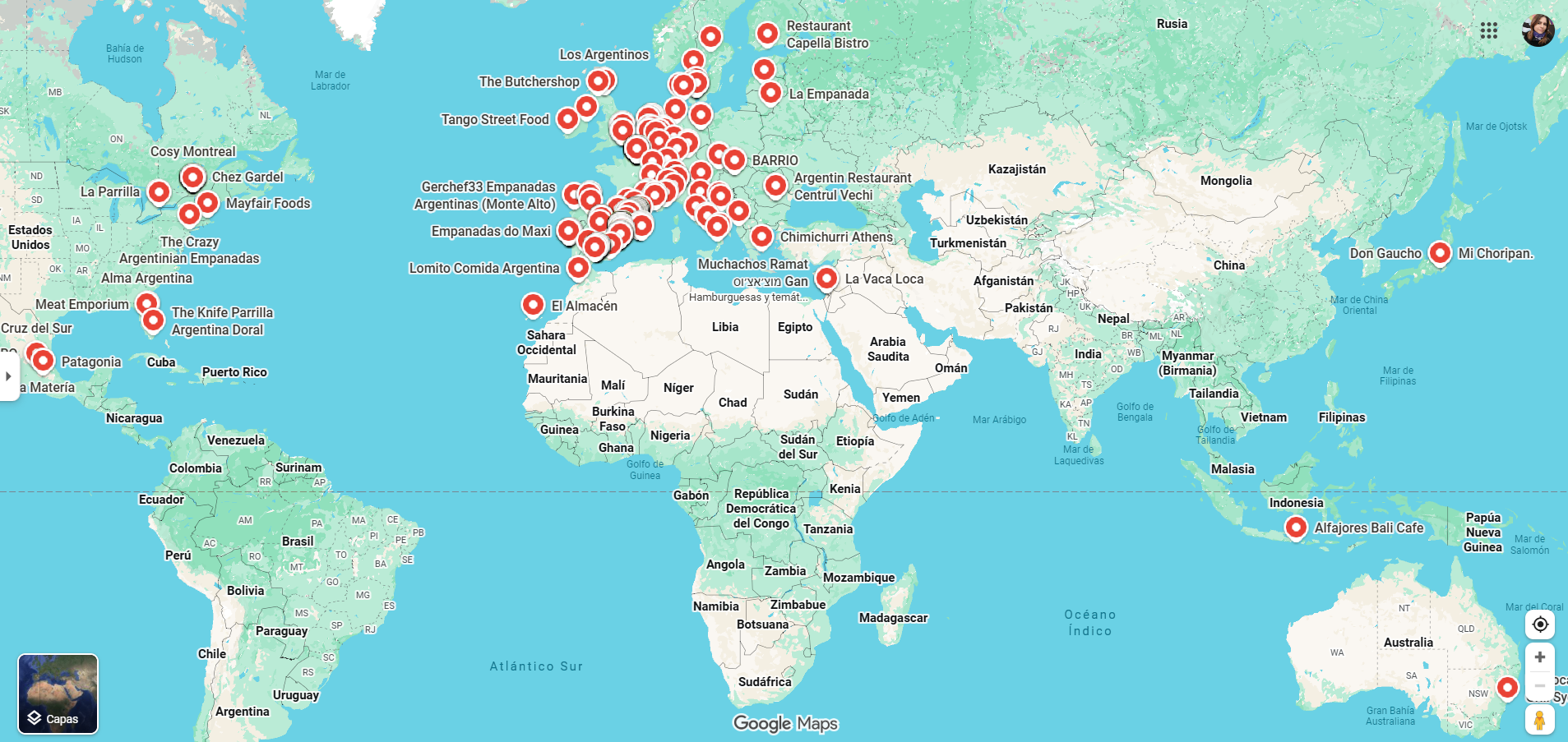 Después de publicar el libro Costumbres Argentinas en Tierras Lejanas, comencé a conectar con más argentinos y me di cuenta de que muchos tenían una necesidad que yo también tenía desde que emigré ¿Dónde encuentro cosas argentinas? Entonces creé una lista colaborativa gratuita en Google Maps. Ahí podes encontrar lugares para ir físicamente (bares, restaurantes, gimnasios, despensas de productos, psicólogos, academias de tango o folclore, mini markets latinos, supermercados con productos nuestros, parrilleros al aire libre y mucho más. Todo lo relacionado con nuestras costumbres argentinas ya sea de emprendedores argentinos o no. Hay más de 700 ubicaciones y sigue creciendo día a día gracias al aporte de todos los que forman parte.